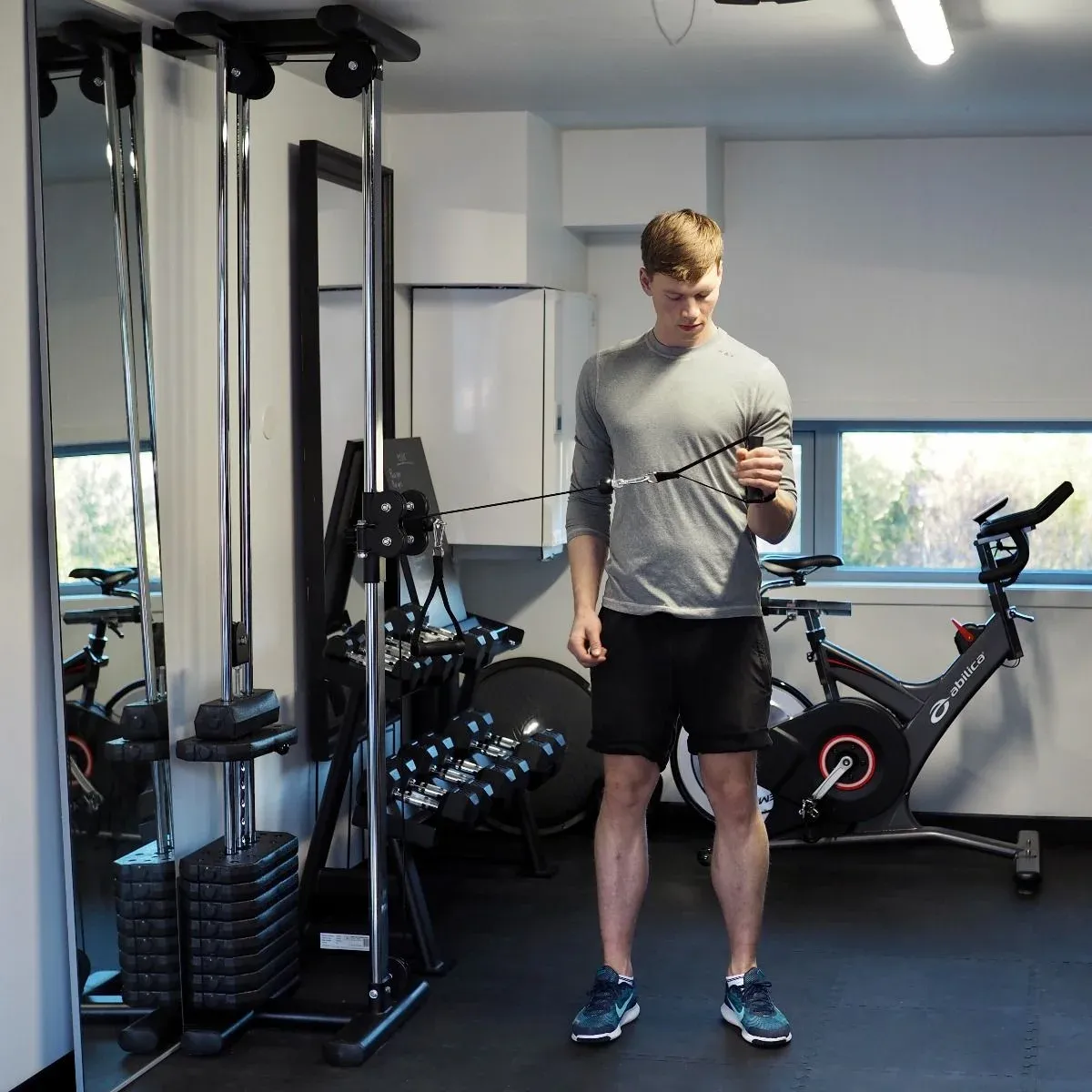 - Bruk en kabelmaskin med taugrep. Fest kabelen i hodehøyde eller litt høyere.